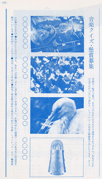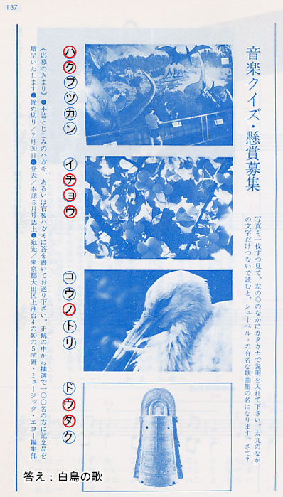 ★今号からクイズが、写真クイズから“まちがいさがし”になった。ちなみに今号の問題はこう。「次の説明の中に、まちがいがひとつだけあります。ABCDの記号で答えてください。A:ベートーベンは補聴器を使っていた。B:交響曲は4楽章にきまっている。C:ドレミファはラテン語である。D:音楽の父と呼ばれているのは、J・S・バッハである」……このように、写真クイズよりもずいぶん簡単になり、物足りないレベルのクイズになってしまった。また、「詩人の広場」が、今号から「顔写真」を一緒に送るよう要求するようになった。今なら写真のプリントは家庭でも簡単にできるけれども、この当時は写真屋さんにネガを持っていってプリントしてもらう必要があったことを考えると、ずいぶん面倒な投稿条件を付けたものである。この当時だとカメラがない家庭もあっただろうに。